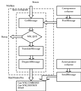 Основная работа, которую должно выполнять приложение, заключается в обслуживании собственной очереди сообщений. Обычно приложение в цикле опрашивает свою очередь сообщений. Обнаружив сообщение, приложение с помощью специальной функции из программного интерфейса Windows распределяет его нужной функции окна, которая и выполняет обработку сообщения.