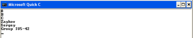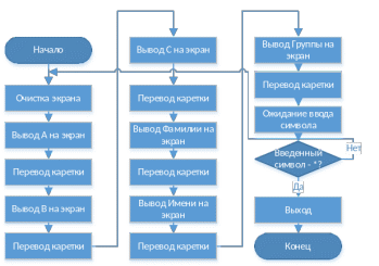 В программе дополнительно вывести столбиком (построчно) фамилию, имя и отчество студента. Организовать циклическое выполнение основной части программы при вводе ожидаемого символа, отличного от символа звездочки (“*”). Развернуть и запустить СП QC25 (есть на сайте) и проверить работу своей программы в этой оболочке.