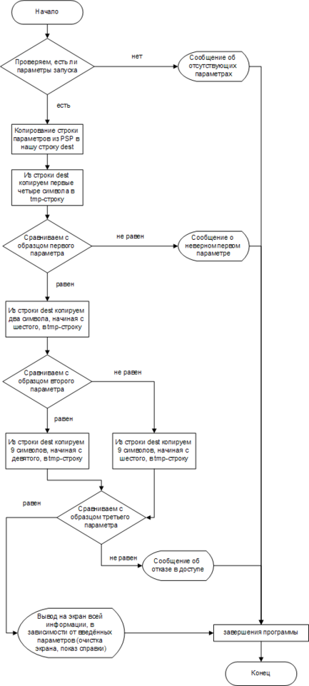 3) при неверном пароле (третий параметр) на экран выводится сообщение об отказе в доступе и работа программы завершается
