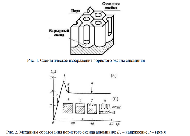Схематически пористый оксид можно представить в виде плотноупакованных ячеек, каждая из которых содержит в центре пору (рис. 1). Механизм образования пористой структуры оксида таков, что пора всегда отделена от алюминиевой подложки барьерной оксидной пленкой. Образование пор связано с одновременным протеканием процесса образования и растворения оксида. Формирование пористого оксида происходит в водных растворах серной, щавелевой и ортофосфорной кислот электрохимическим методом. Механизм образования представлен на рисунке 2. Линейное увеличение напряжения на начальной стадии процесса (участок 1 на кривой) связано с формированием непористого (барьерного слоя) оксида. Затем в оксиде зарождаются поры, при этом толщина барьерного слоя незначительно снижается, что выражается появлением убывающего участка 2 на кривой. В дальнейшем толщина барьерного оксида стабилизируется (участок 3). Таким образом, рост пористого оксида можно представить как последовательное продвижение границы раздела «оксид – металл» вглубь подложки. На данный момент существуют две концепции формирования анодной пористой структуры оксида алюминия: физико-геометрическая концепция и концепция критической плотности тока, являющаяся продолжением физико-геометрической. Физико-геометрическая модель предполагает, что основой образования как пористого, так и беспористого оксида является реакция взаимодействия алюминия с чистой водой, протекающая в сильных полях, а образование пор связано с одновременным протеканием процесса образования и растворения оксида: 2Al2O32Al + 3H2O – 6 e– + 6H+ .