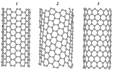 Тогда при сворачивании получаемых «лент» и сшивании их краев возникают два основных типа нанотрубок — нехиральные и хиральные. Среди нехиральных нанотрубок выделяют так называемые зигзагообразные и зубчатые типы. Структуры основных типов нанотрубок представлены на рис. 2.