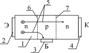 | 1 – п/п материал (Si) 2 – эмиттер 3 – база 4 – коллектор 5 – траектории подвижных носителей заряда (электронов) 6 – эмиттерный переход 7 – коллекторный переход |
