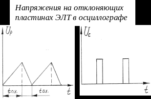 На одну пару пластин (горизонтальную) подается напряжение развертки Up (пилообразное), под действием которого электронный луч прочерчивает на экране горизонтальную линию (время tп.х. – время прямого хода) и возвращается в исходное положение (tо.х. – время обратного хода).