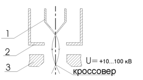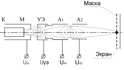 Электронная пушка состоит из иммерсионного объектива (К-М-УЭ), иммерсионной линзы (УЭ-А1) и главной проекционной линзы (А1-А2) – иммерсионной линзы.