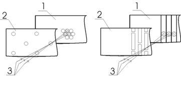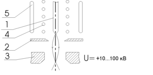 | Электронная пушка с термокатодом из вольфрамовой проволоки 1 – катод; 2 – управляющий электрод; 3 – анод | Электронная пушка с катодом Броерса из гексаборида лантана с косвенным подогревом1 – катод; 2 – управляющий электрод; 3 – анод; 4 – нить подогрева; 5 – тепловой экран |