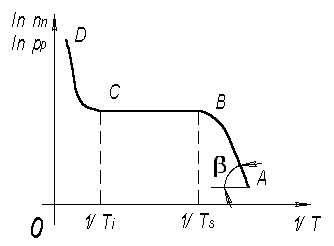 При низких температурах (участок АВ) неосновные носители зарядов практически отсутствуют, растет только концентрация основных носителей