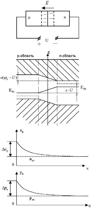Диффузионное движение частиц через p-n - переход при подключении прямого напряжения U, когда частицы становятся неосновными носителями заряда, как уже было отмечено, называется инжекцией неосновных носителей заряда. При этом концентрации неосновных носителей возрастают с увеличением U: