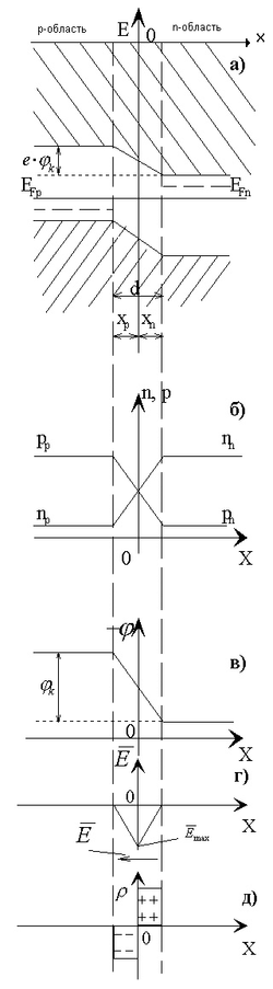 В процессе диффузии электроны перемещаются в p - область и рекомбинируют с дырками, образуя нескомпенсированный отрицательный объемный заряд (рис. д), а дырки перемещаются в n-область, рекомбинируют с электронами и образуют нескомпенсированный положительный объемный заряд (рис. д). Этот двойной слой электрических объемных зарядов создает вблизи границы электрическое поле напряженностью