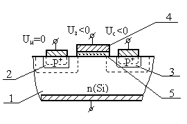 Схема МОП - транзистора с индуцированным р-каналом 1 - подложка; 2 - исток; 3 - сток; 4 - затвор; 5 – окисел (SiO2) | Наиболее часто используются полевые транзисторы с изолированным затвором: МДП - транзисторы (металл - диэлектрик - полупроводник) и МОП - транзисторы (металл - окисел - полупроводник). МОП - транзистор с индуцированным р-каналом работает лишь при подаче на затвор отрицательного напряжения Uз<0 относительно истока Uи=0 и подложки Uп=0. |