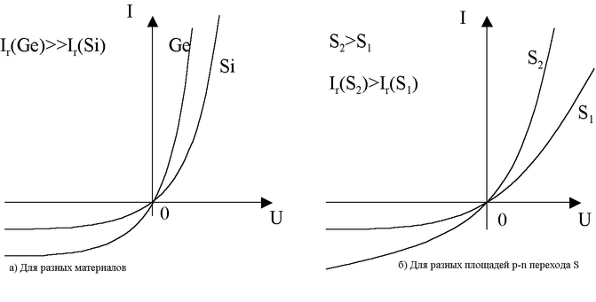 При низких прямых напряжениях U ток рекомбинации Ir составляет заметную долю в прямом токе I, с увеличением U диффузионный ток растет быстрей