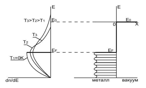 При некоторой температуре Т энергия электронов начинает превышать энергетический барьер Е0 на границе «металл-вакуум» (см. рисунок) и электроны начинают эмиттировать в вакуум.