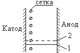 Сечение плоского триода | Рассмотрим триод плоской конструкции с сеткой виде параллельных прутков (1- плоскость между витками сетки, 2 – плоскость витков сетки). |