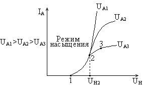 Анодные характеристики идеального диода | В режиме насыщения IA не зависит от UA и определяется только напряжением накала UH. |