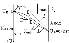При дальнейшем повышении UH эмиттирующие электроны увеличивают объемный отрицательный заряд. Электронное “облако” образует область отрицательного потенциала Umin, находящегося на расстоянии Xmin (Xmin0,01…0,1 мм). Таким образом, вблизи катода (0 < X < Xmin) существует тормозящее электронное поле и вектор
