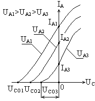 | | UC01, UC02, UC03 – напряжения запирания триода (зависит от UA ). IA1, IA2, IA3 – начальные анодные токи (при UC = 0). В области отрицательных значений UC кривые описываются законом “степени 3/2”. В этом случае IC = 0. При UC >0 триод работает в режиме прямого перехвата электронов: IK = IA + IC |
