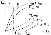 | | При Uc < 0 кривые выходят из точек UA1, UA2, т.е. для преодоления потенциального барьера сетки необходимо на аноде создать начальный потенциал UA1, UA2. |