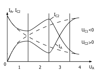 | | I - режим возврата электрода к сетке (при малых значениях UA ). II - режим примого перехвата электрода сеткой (при больших UA). |