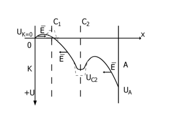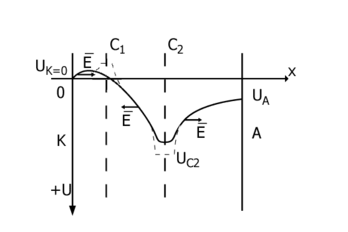 20В энергии электронов достаточно для вторичной эмиссии с анода. Эти вторичные электроны движутся к экранирующей сетке С2, вызывая увеличение IC2 и уменьшение IA.