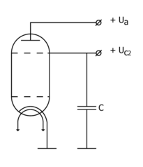 | Схема включения экранирующей сетки | Четырёхэлектродная лампа, имеющая катод, анод, управляющую и экранирующую сетки, называется тетродом. Экранирующая сетка (обычно проволочная спираль) располагается между управляющей сеткой и анодом и заземляется по переменному току через ёмкость С. На экранирующую сетку обычно подаётся положительное напряжение, равное 60–100% от анодного напряжения. |