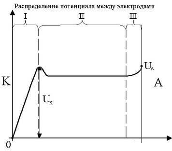 Столб разряда представляет собой плазму, в которой концентрации электронов и ионов равны, а падение напряжения мало. В анодной области наблюдается небольшое падение U.