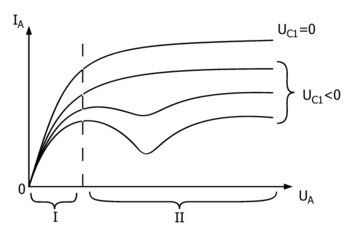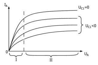 I участок – нерабочая область (режим возврата электронов к сетке);II участок – рабочая область (режим прямого перехвата электронов). |