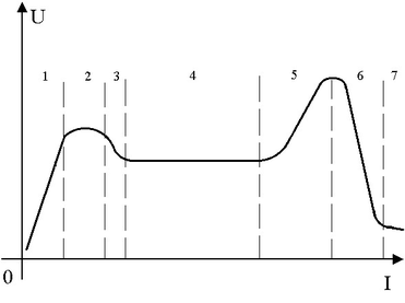 3. Переходная область от темного разряда к тлеющему. При этом напряжении происходит более интенсивная ионизация газа. Поскольку ионы двигаются медленнее электронов, вблизи катода скапливается большое число ионов и формируется положительный объемный заряд (ПОЗ), который уменьшает потенциальный барьер и способствует дальнейшей эмиссии электронов с катода. Для поддержания разряда теперь требуется меньшая разность потенциалов U.