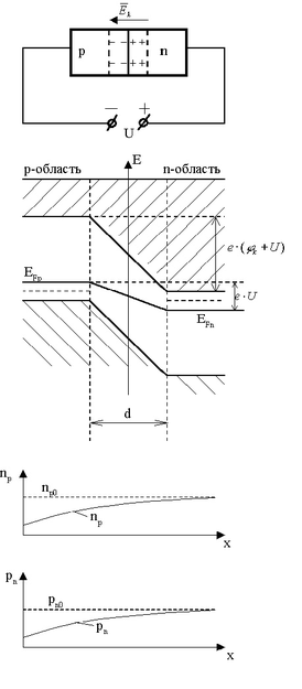 . При включении обратного внешнего напряжения высота потенциального барьера p-n-перехода равна e (k + U) = e (0,36+ U). -