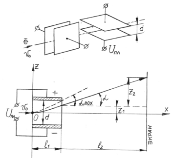 Отклоняющая система электронного пучка состоит из двух пар плоских параллельных пластин (рис.1);