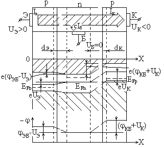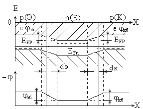 Таким образом, контактная разность потенциалов, потенциальный барьер и ширина эмиттерного перехода уменьшаются [(эб-Uэ), е(эб-Uэ), dэ], а на коллекторном переходе - увеличиваются [(эб+Uэ), е(эб+Uэ), dk] (рис. 8).