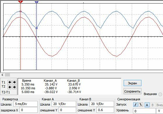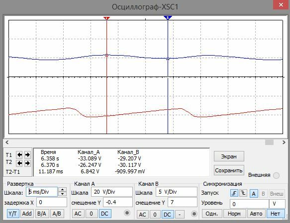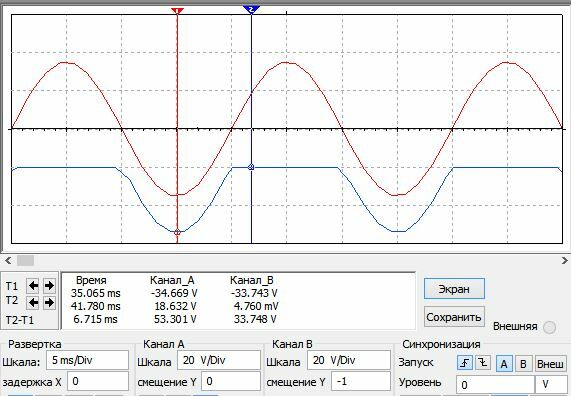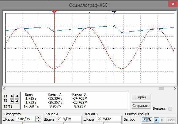 Рисунок 13 – Двухполупериодный выпрямитель с LC-фильтром (вход фильтра)