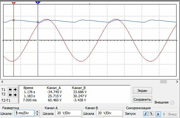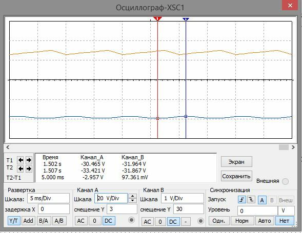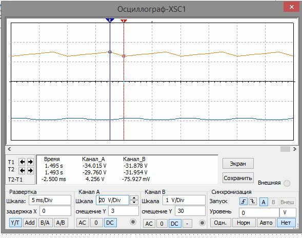 Рисунок 14 – Двухполупериодный выпрямитель с LC-фильтром (выход фильтра)