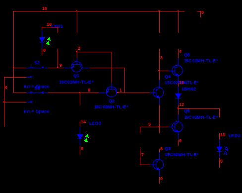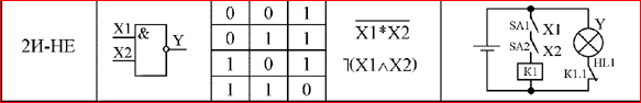 Ниже пример схемы со светодиодными индикаторами и соответствующей зависимостью выходного сигнала от двух входных, по функции И-НЕ: