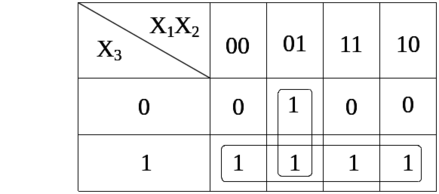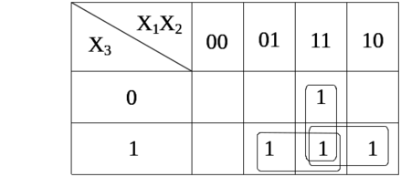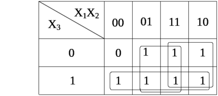 Два минтерма, находящиеся в соседних клетках, т.е. в одном контуре, могут быть заменены одним логическим произведением, содержащим на одну переменную меньше. Исключается та переменная, которая меняет своё значение при переходе из одной клетки в другую. Если соседними являются две пары минтермов, то такая группа из четырех минтермов может быть заменена конъюнкцией двоичных переменных, содержащих на две переменных меньше. В общем случае, наличие единиц в 2n соседних клетках позволяет исключить n переменных.
