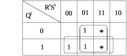 Перенеся на карту Карно (рис.2) таблицу переходов RS-триггера и доопределив значения Qt+1 единицами можно получить МДНФ (минимизированую дизъюнктивную нормальную форму) характеристического уравнения RS-