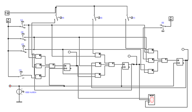 При закрытом ключе 3 имеем регистр со сдвигом влево (источником сигнала является ключ 8, синхронизирующий сигнал даёт источник импульсного сигнала):