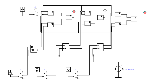 6.1.3. Три пятивольтовых источника напряжения подсоединяются через переключатели к входам D1 триггеров каждого разряда.