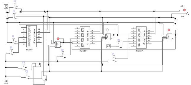 При замкнутых ключах 1 и 2, устанавливаем ключи 5,6,7 соответственно в нужные положения, по началу синхроимпульса лампочки будут отображать занесенные 1 и 0 в соответствующие разряды:
