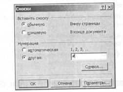 Для того чтобы пометить заголовок раздела сноской, нужно установить курсор перед первой буквой заголовка раздела и из меню Вставка выбрать команду Сноска. В открывшемся диалоговом окне Сноски (рис.1) в группе Вставить сноску нужно установить переключатель в положение обычную, а в группе Нумерация — в положение другая. В поле ввода номера сноски следует ввести символ "#" и нажать кнопку ОК.