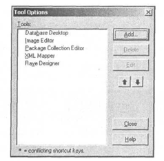 Если в меню Tools команды Help Workshop нет, то надо из этого же меню выбрать команду Configure Tools и в открывшемся диалоговом окне Tool Options (рис.4) щелкнуть на кнопке Add. В результате этого откроется диалоговое окно Tool Properties (рис. 5), в поле Title которого надо ввести название программы — Help workshop, а в поле Program — полное (т. е. с указанием пути) имя исполняемого файла программы Microsoft Help WorkShop — C:\Program Files\Borland\Delphi7 \Help\Tools\HCW.exe. Для ввода имени файла можно воспользоваться кнопкой Browse.