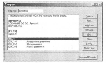 Для того чтобы во время работы программы пользователь, нажав клавишу <F1>, мог получить справочную информацию, надо чтобы свойство HelpFile главного окна приложения содержало имя файла справочной системы, а свойство HelpContext — числовой идентификатор нужного раздела (рис. 20). Вспомните, идентификаторы разделов справочной системы перечислены в разделе [map] файла проекта справочной системы (см. рис.18).