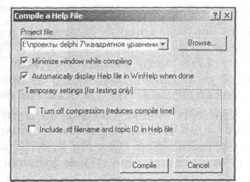 После того, как будет подготовлен файл проекта, можно выполнить компиляцию, щелкнув на находящейся в окне проекта кнопке Save and Compile. Однако первый раз компиляцию проекта справочной системы лучше выполнить выбором из меню File команды Compile, в результате выполнения которой открывается диалоговое окно Compile a Help File (рис. 19).