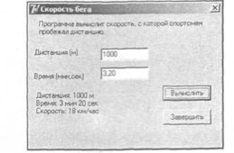 Функция Button1Click выполняет расчет скорости и выводит результат расчета в поле Label4. Исходные данные вводятся из полей редактирования Editl и Edit2 путем обращения к свойству Text. Свойство Text содержит строку символов, которую во время работы программы введет пользователь. Для правильной работы программы строка должна содержать только цифры. Для преобразования строки в числа в программе используются функции StrToInt и StrToFloat. Функция StrToInt проверяет символы строки, переданной ей в качестве параметра (Editl.Text— это содержимое поля Editl), на допустимость и, если все символы верные, возвращает соответствующее число. Это число записывается в переменную dist. Аналогичным образом работает функция StrToFloat, которая возвращает дробное число, соответствующее содержимому поля Edit2. Это число записывается в переменную t.
