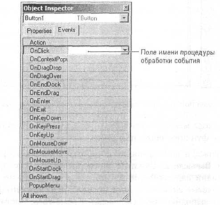 Чтобы приступить к созданию процедуры обработки события, надо сначала в окне Object Inspector выбрать компонент, для которого создается процедура обработки события. Затем в этом же окне нужно выбрать вкладку Events (События).