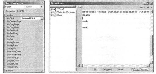 Для того чтобы создать функцию обработки события, нужно сделать двойной щелчок мышью в поле имени процедуры обработки соответствующего события. В результате этого откроется окно редактора кода, в которое будет добавлен шаблон процедуры обработки события, а в окне Object Inspector рядом с именем события появится имя функции его обработки (рис. 3).