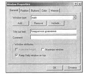 В результате щелчка на ОК появляется окно Window Properties, в поле Title bar text вкладки General которого нужно ввести заголовок главного окна создаваемой справочной системы (рис.12).