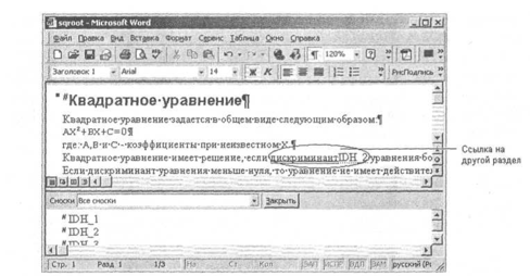 На рис.3 приведен вид окна редактора текста во время подготовки файлa справочной информации для программы решения квадратного уравнения. Слово "дискриминант" помечено как ссылка на другой раздел справки здесь предполагается, что раздел справки, в котором находятся сведения о дискриминанте, помечен сноской #, имеющей идентификатор IDH_2).