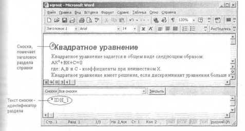 Рис. 2. Вставка в документ сноски, помечающей заголовок раздела справки