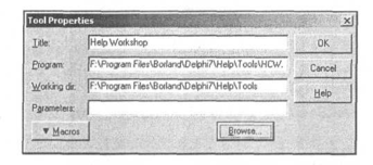 Если в меню Tools команды Help Workshop нет, то надо из этого же меню выбрать команду Configure Tools и в открывшемся диалоговом окне Tool Options щелкнуть на кнопке Add. В результате этого откроется диалоговое окно Tool Properties (рис. 5), в поле Title которого надо ввести название программы — Help workshop, а в поле Program — полное (т. е. с указанием пути) имя исполняемого файла программы Microsoft Help WorkShop ( HCW.exe). Если с Turbo Delphi 2006 этот файл не поставляется, то его нужно взять у преподавателя и поместить в папку C:\Student\Delphi\ Tools \Help. Тогда полное имя файла будет C:\Student\Delphi\\Help\Tools\HCW.exe. Для ввода имени файла можно воспользоваться кнопкой Browse.
