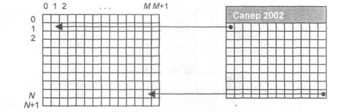 В программе игровое поле представлено массивом N+2 на М+2, где N*M размер игрового поля. Элементы массива с номерами строк от 1 до N и номерами столбцов от 1 до М соответствуют клеткам игрового поля (рис. 2), первые и последние столбцы и строки соответствуют границе игрового поля.