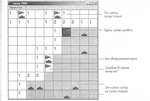 Пример окна программы в конце игры, после того как игрок открыл клетку, в которой находится мина, приведен на рис.1.